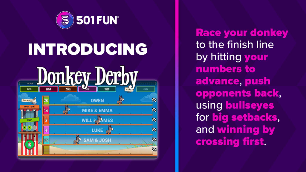 Race you donkey to the finish line by hitting your number to progress. Push your friends back by hitting their number or the bullseye. Win by cross the line first.